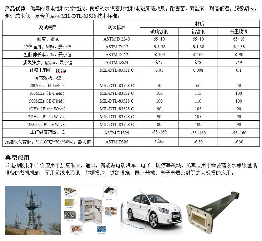 復(fù)合導(dǎo)電橡膠條是將含銀等導(dǎo)電金屬粉體通過機(jī)械共混的方式在硅橡膠或其他橡膠中混合均勻,在特定工藝參數(shù)下采用復(fù)合擠出成型與不導(dǎo)電硅橡膠化學(xué)結(jié)合制備的一種新型高分子材料。具有良好的導(dǎo)電性和電磁屏蔽效能,優(yōu)異的水汽密封性、耐鹽霧,耐霉菌,耐高低溫,服役期長,制造成本低廉。按照材質(zhì)不同可分為純銀,鋁鍍銀,玻璃鍍銀,銅鍍銀和石墨鍍鎳等。