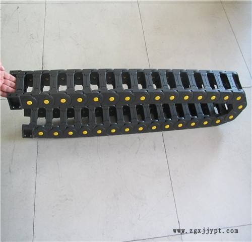 外形似坦克鏈,由眾多的單元鏈接組成,鏈接之間轉動自如。相同系列的拖鏈的內高、外高、節(jié)距相同,拖鏈內寬、彎曲半徑R可有不同的選擇。單元鏈節(jié)由左右鏈板和上下蓋板組成,拖鏈每節(jié)都能打開,裝拆方便,不必穿線,打開蓋板后即可把電纜、油管、氣管、水管等放入拖鏈。另可提供分隔片,將鏈內空間按需要分隔開。塑料拖鏈材料:增強尼龍,具有較高的壓力和抗拉負荷、良好的韌性、高彈性和耐磨性、阻燃、高低溫時性能穩(wěn)定,可以在室外使用,尼龍含量的多少決定了拖鏈的使用強度和耐磨性以及運行起來的噪音大小。尼龍含量從5%-17%不等,但超不過19%。一般都是30%左右的含量。抗耐性:耐油、耐鹽,并有一定的耐酸、耐堿能力。運行速度和加速度(具體速度、加速度視運行情況而定)。運行壽命。看結構不但能夠在力學上發(fā)回作用,而且要看外觀。