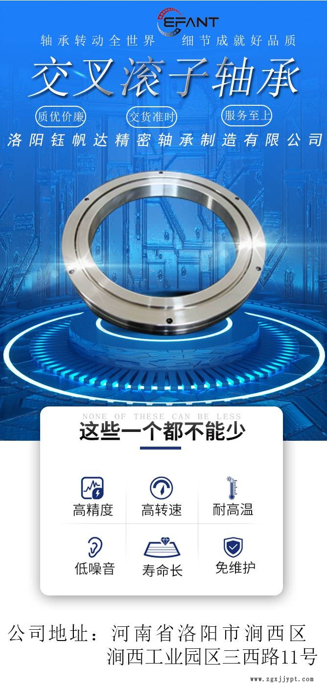 洛陽鈺帆達精密軸承廠家各種系列的交叉滾子軸承,精密交叉滾子軸承,交叉滾柱軸承,十字交叉滾子軸承,交叉圓柱滾子軸承,薄壁交叉滾子軸承,交叉滾子軸承,超輕超薄型交叉圓柱滾子軸承等,每種軸承型號都有對應的參數表及圖紙供您參考。在交叉滾子軸承中,因圓柱滾子在呈90度的V型溝槽滾動面上通過間隔保持器被相互垂直排列。這種設計使交叉滾子軸承就可以承受徑向負荷、軸向負荷及力矩負荷等所有方向的負荷。同時內外套圈的尺寸被小限度的小型化,特別極薄形式是接近于極限的小型尺寸,而且有高剛性,所以非常適合于工業用機器人的關節部位或者旋轉部位、機械加工中心的旋轉工作臺、機械手旋轉部位、精密旋轉工作臺、醫療儀器、計量器具、IC制造裝置等廣泛用途。
