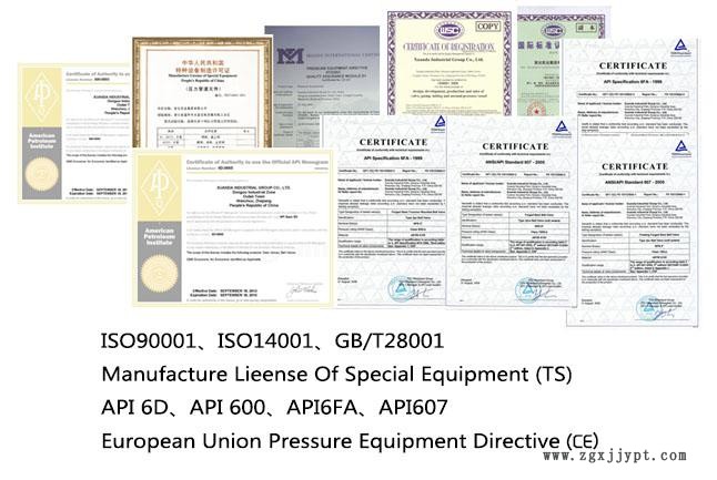 公司建立了完善的質量服務管理保證體系,公司先后通過了ISO90001、ISO14001、 GB/T28001管理體系認證;特種設備制造許可證TS;美國石油協會 API 6D、 API 600、API6FA、API 607;歐盟壓力指令CE認證等。