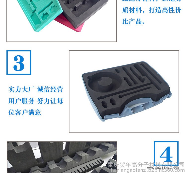 EVA泡沫:防震、防水、耐腐蝕、隔音、保溫等;常用于五金、儀器**、數碼產品等工具箱內襯內托,工業,機械料架卡槽等。顏色、硬度、形狀可定制。