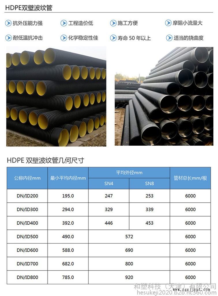 HDPE雙壁波紋管材是以高密度聚乙烯為原料的一種新型輕質管材,具有重量輕、耐高壓、韌性好、施工快、壽命長等特點,其優異的管壁結構設計,與真他結構的管材相比,成本大大降低。并且由于連接方便、可靠,在國內外得到廣泛應用。大量替代混凝土管和鑄鐵管。主要優點:1、抗外壓能力強外壁呈環形波紋狀結構,大大增強了管材的環剛度,從而增強了管道對土壤負荷的抵抗力,在這個性能方面,HDPE雙壁波紋管與其他管材相比較具有明顯的優勢。2、工程造價低在等負荷的條件下,HDP E雙壁波紋管只需要較薄的管璧**可以滿足要求。因此,與同材質規定的實壁管相比,能節約一半左右的原材料,所以HDPE雙壁波紋營造價也較低。這是該管材的又一個很突出的特點。3、施工方便由于HDPE雙壁波紋管重量輕,搬運和連接都很方便,所以施工快捷、維護工作簡單。在工期緊和施工條件差的情況下、其優勢更加明顯。4、摩阻系數小,流量大采用HDPE為材料的HDPE雙壁波紋管比相口徑的其他管材可通過更大的流量。換言之,相同的流量要求下,可采用口徑相對較小的HDPE雙壁波紋管。5、良好的耐低溫,抗沖擊性能HDPE雙壁波紋管的脆化溫度是-70℃。一般低溫條件下(-30℃以上)施工時不必采取特殊保護措施,冬季施工方便,而且,HDPE雙壁波紋管有良好的抗沖擊性。6、化學穩定性佳由于HDPE分子沒有極性,所以化學穩定性極好。除少數的強氧化劑外,大多數化學介質對其不起破壞作用。一般使用環境的土壤、電力、酸堿因素都不會使該管道破壞,不滋生細菌,不結垢,其流通面積不會隨運行時間增加而減少。7、物理性能環剛度( KN/m????):SN4≥4 SN8≥8沖擊性能(TIR),%:≤10環柔性:試樣圓滑, 無反向彎曲, 無破裂, 兩壁無脫開烘箱試驗:無氣泡, 無分層, 無開裂連接密封試驗:不泄露蠕變比率:≤48、使用壽命長在不受陽光紫外線條件下,HOPE的雙壁波紋管的使用年限可達50年以上。9、優異的耐磨性能德國曾用試驗證明,HOPE的耐磨性甚至比鋼管還要高幾倍。10、適當的撓曲度一定的長度的HDPE雙壁波紋管軸向可略為撓曲,不受地面一定程度的不均勻沉降的影響,可以不用管件**直接鋪在略為不直的溝槽內等等。應用范圍1、 市附排水、 排污管道系統工程;2、 公寓、 住宅小區地下埋設排水排污;3、 高速公路預埋管道,高爾夫球場地下滲水管網;4、 農田水利灌溉輸水、 排澇等水利工程;5、 化工、 礦山用于流體的輸送及通風等;15、 地下管線的保護套管和通信電纜護套管等。