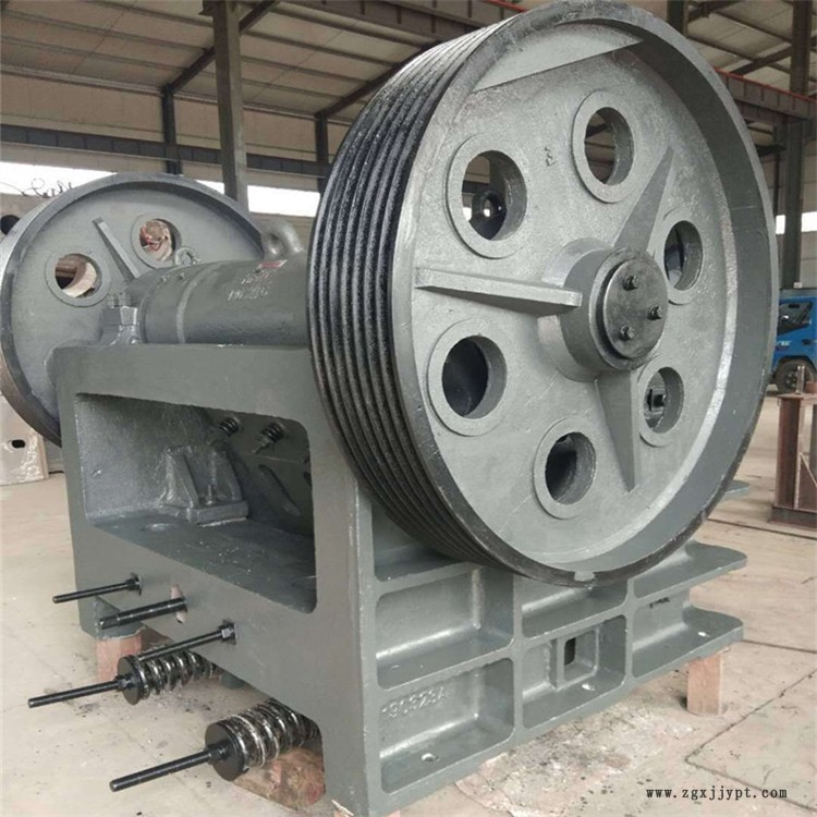 本機(jī)主要有機(jī)架、動(dòng)顎、偏心軸、顎板、肘板等零部件組成,電動(dòng)機(jī)通過三角皮帶轉(zhuǎn)動(dòng)偏心軸,使動(dòng)顎按已調(diào)整好的軌道進(jìn)行運(yùn)動(dòng),從而將破碎腔內(nèi)的物料破碎。機(jī)架系單個(gè)整體澆鋼結(jié)構(gòu),機(jī)架前壁上裝有用楔形螺栓緊固的固定顎板,在破碎腔左右的機(jī)架側(cè)壁上裝有邊護(hù)板,以防止機(jī)架側(cè)壁的磨損。動(dòng)顎為一成型鑄鋼件,正面裝有活動(dòng)顎板,其上部借偏心軸與滾柱軸承懸掛在機(jī)架上,下部支承在肘板上,并與肘板成滾動(dòng)接觸,在偏心軸兩端裝有飛輪和皮帶輪。