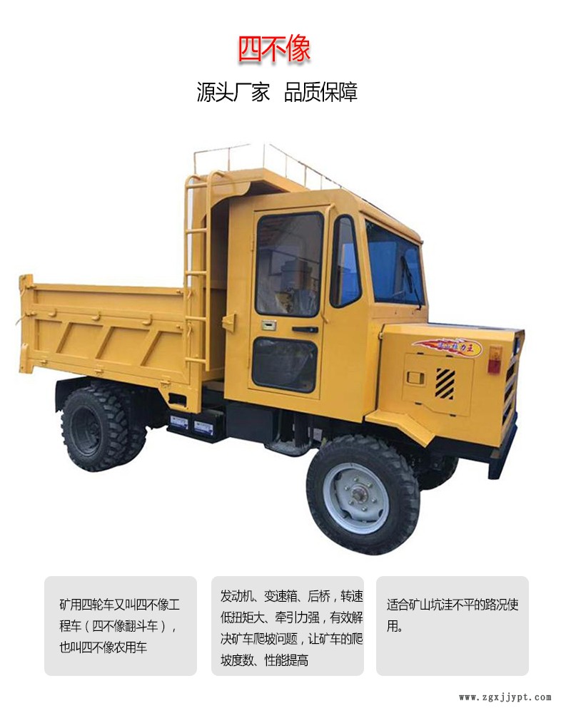 礦用**車(chē)又叫四不像工程車(chē)(四不像翻斗車(chē)),也叫四不像農(nóng)用車(chē),其車(chē)身和車(chē)頭是一體的,行動(dòng)比較靈活,不像拖拉機(jī)那樣笨拙,而且因?yàn)樗牟幌裼星昂篁?qū)動(dòng),同時(shí)它可以根據(jù)客戶(hù)需要安裝各種馬力的柴油機(jī),所以非常有勁,用起來(lái)非常順手方便。cm05
