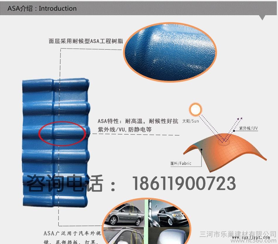 合成樹脂瓦采用高耐候工程樹脂ASA研制而成的.ASA是丙烯腈.苯乙烯和丙烯酸橡膠組成的三元聚合物.合成樹脂瓦具有顏色持久.質輕.自防水.堅韌.保溫隔熱.隔音.耐腐蝕.抗風防震.抗冰雹.抗污.綠色環保.防火.絕緣.安裝方便等優點.而且造型美觀立 體感強.顏色**中國元素.使得它被廣泛應用于各類**建筑屋面裝飾.尤其目前國內大力推廣的“平改坡"工程.