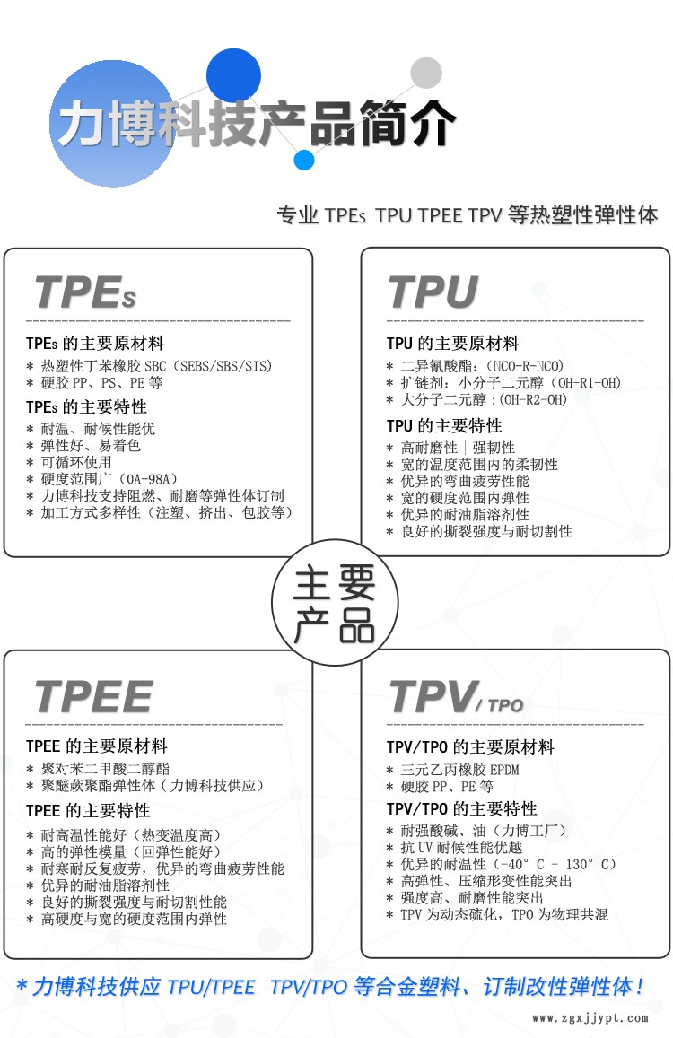 力博全程提供詳細(xì)TPE、TPR、TPO、TPEE、TPU、PA12彈性材料產(chǎn)品資料。