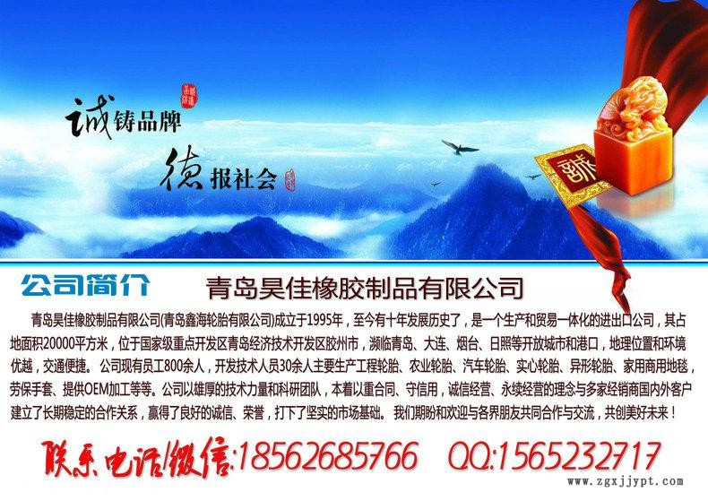 青島昊佳橡膠制品有限公司(青島鑫海輪胎有限公司)成立于1995年,至今有十年發(fā)展歷史了,是一個(gè)生產(chǎn)和貿(mào)易一體化的進(jìn)出口公司,其占地面積20000平方米,位于**級(jí)重點(diǎn)開(kāi)發(fā)區(qū)青島經(jīng)濟(jì)技術(shù)開(kāi)發(fā)區(qū)膠州市,瀕臨青島、大連、煙臺(tái)、日照等開(kāi)放城市和港口,地理位置和環(huán)境優(yōu)越,交通便捷。 公司現(xiàn)有員工800余人,開(kāi)發(fā)技術(shù)人員30余人主要生產(chǎn)工程輪胎、農(nóng)業(yè)輪胎、汽車輪胎、實(shí)心輪胎、異形輪胎、家用商用地毯,勞保手套、提供OEM加工等等。公司以雄厚的技術(shù)力量和科研團(tuán)隊(duì),嚴(yán)格按照“ISO9001:2000質(zhì)量體系”和“CCC強(qiáng)制性認(rèn)證”的要求進(jìn)行企業(yè)管理、和生產(chǎn),本著以重合同、守信用,誠(chéng)信經(jīng)營(yíng)、永續(xù)經(jīng)營(yíng)的理念與多家經(jīng)銷商國(guó)內(nèi)外客戶建立了長(zhǎng)期穩(wěn)定的合作關(guān)系,贏得了良好的誠(chéng)信、榮譽(yù),打下了堅(jiān)實(shí)的市場(chǎng)基礎(chǔ)。