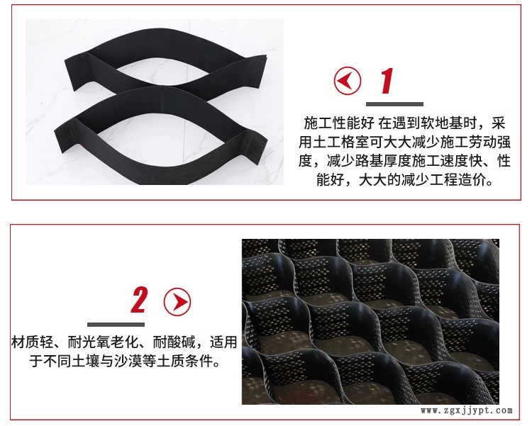土工格室是由強化的HDPE片材料,經高強力焊接而形成的一種三維網狀格室結構。一般經超聲波針式焊接而成。因工程需要,有的在膜片上進行打孔。 1、具有伸縮自如,運輸可縮疊,施工時可張拉成網狀,填入泥土、碎石、混凝土等松散物料,構成具有強大側向限制和大剛度的結構體。 2、材質輕、耐磨損、化學性能穩定、耐光氧老化、耐酸堿,適用于不同土壤與沙漠等土質條件。 3、較高的側向限制和防滑,防變形、有效的增強路基的承載能力和分散荷載作用。 4、改變土工格室高度、焊距等幾何尺寸可滿足不同的工程需要。 5、伸縮自如,運輸體積小;聯接方便、施工速度快。