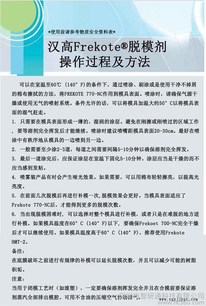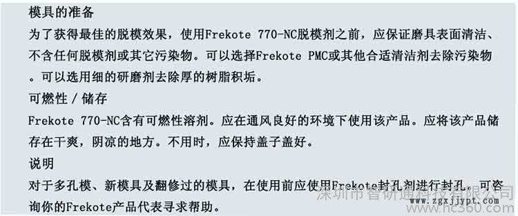 為了獲得**的脫模效果,使用Frekote 700-NC脫模劑之前,應保證磨具表面清潔、不含任何脫模劑或其它污染物。可以選擇Frekote PMC或其他合適清潔劑去除污染物。可以選用細的研磨劑去除厚的樹脂積垢。