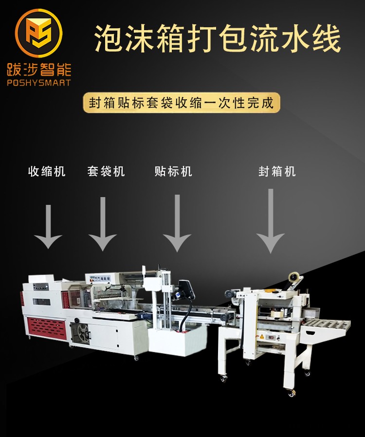電商專用泡沫箱打包流水線是由封箱機、貼標機、封切套袋機及收縮機組合而成。先由泡沫箱側封機對泡沫箱進行整圈封箱,此款封箱機是根據泡沫箱包裝特性而專門研發設計的包裝設備,采用即貼膠帶封口,經濟快速、容易調整,可一次性完成整圈封箱,封箱效果更牢固;接著輸送至貼標機,通過傳感器檢測進行貼標流程;再由封切套袋機對泡沫箱自動套袋自動封切;然后輸送至熱收縮機對上述包裝程序進行收縮,經過加熱使收縮薄膜裹緊產品或包裝件,充分顯示物品外觀、提高產品的展銷性、增加美觀及價值感。