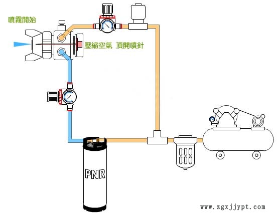 ST-5系列自動噴頭內部具有一個氣動式活塞機械,活塞上方裝有一支不銹鋼噴針,而活塞后方則裝有一組高張力彈簧,當壓縮空氣停止供應時,彈簧將活塞噴針向前頂住,此時噴針與噴嘴以高精密度的緊密配合來阻斷液體的通過,反之,當壓縮空氣開始供應時,壓縮空氣的壓力將活塞推開,使噴針與噴嘴間產生空隙讓液體噴出,噴出后的液體隨即與霧化用空氣接觸產生霧化效果。