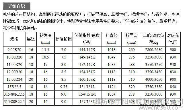 卡車輪胎型號:12.00R24、12.00R20、11.00R20、10.00R20、9.00R20、8.25R20、8.25R16、7.50R16、7.00R16、6.50R16、12R22.5、11R22.5、13R22.5、385/65R22.5、315/80R22.5、295/80R22.5