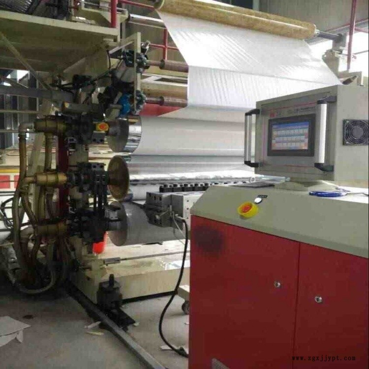 PP地板生產線,由擠出機、模具、五輥壓延機、冷卻系統、牽引機、新一代精加工自動定長切割機、自動成品卸料臺等組成,全自動化控制。PP地板是由擠出機擠出PP的基材,通過五輥壓延機分別把PVC彩膜+PVC耐磨層一次性壓貼復合而成的產品,工藝簡單,貼合靠熱量完成,不含膠水。在由擠出機擠出,在線實現表面覆膜工藝后,再經過表面涂布油漆UV(一般做兩個道),增強其性能,再由多片鋸分切(因為長度已經固定,只需要縱向多片鋸),然后縱橫向開槽,再之后包裝入庫。