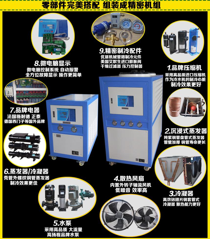 冷水機電動功率分為:0.37KW、0.75KW、1.5KW、2.2KW、3.75KW、4KW…可根據(jù)用戶要求做到45KW。