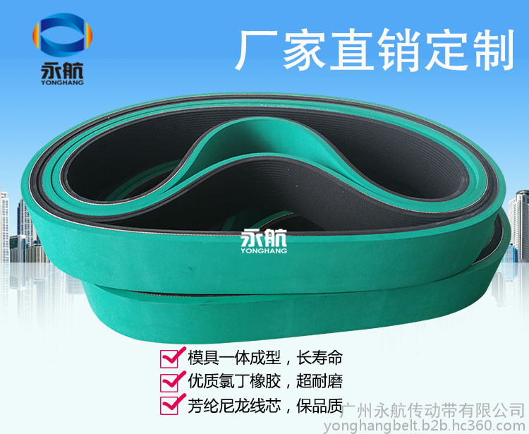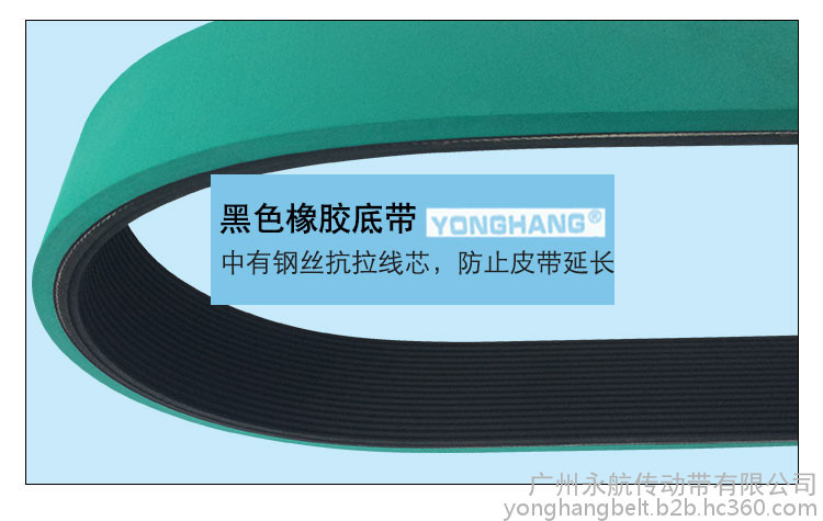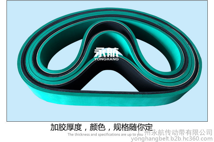 永航牽引皮帶占國內41%市場,采用一體硫化成型工藝,不脫層,不斷列,表面平整,抗拉力強,延伸更小,耐磨損,傳動平穩,不偏位,壽命長等到優點,硬度可以調,顏色可以做綠色、 白色、紅色、黑色,或在表面開圓弧、V型槽等。
