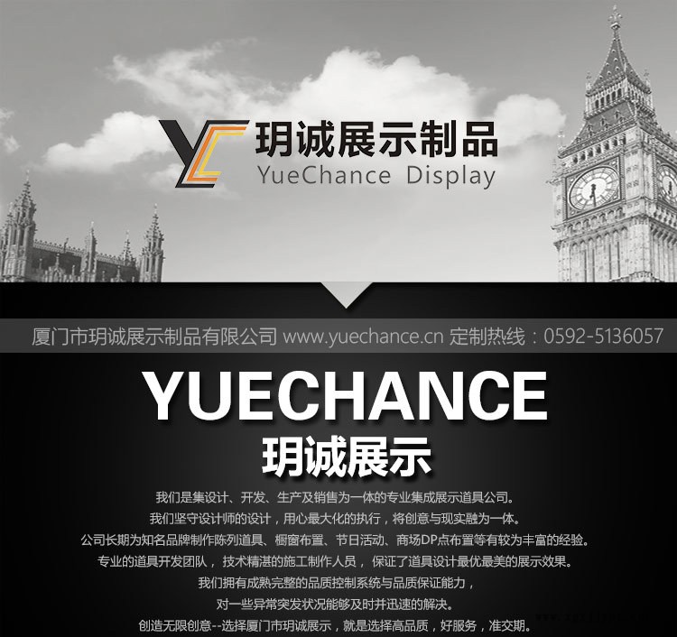 廈門玥誠展示制品有限公司,是一家商業展示道具綜合供應商.公司長期致力于商業道具產品的研發以及生產,5年道 具OEM代工生產經驗,對品牌公司陳列道具、櫥窗布置、節日活動造景、商場美陳布置、室內異形裝飾品、高端會所軟裝布置有較為豐富的經驗、對一些非常規 的材料及制作工藝有良好的認知能力及解決方法。
