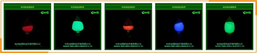 YMO 系列產品為堿土鋁酸鹽材料,原態外觀呈黃綠色或者淺黃色,發光顏色為黃綠色YMB 系列產品為堿土鋁酸鹽材料,原態外觀呈灰白色或者淺黃色,發光顏色為藍綠色YMS 系列產品為堿土硅酸鹽材料,原態外觀呈淺灰色或淺黃色, 發光顏色為天藍色YMR 系列產品為硫氧化物系列,原態外觀呈橙色或淺紅色,發光顏色為橙紅色或紅色YMF 系列產品為堿土鋁酸鹽材料,原態外觀呈黃綠色或者淺黃色,發光顏色為黃綠色YMLS 系列產品為堿土硅鋁酸鹽材料,原態外觀呈灰白色或者淺黃色,發光顏色為淡藍色夜明牌發光顏料的廣泛應用可將發光顏料添加在油墨油漆,塑料橡膠,印花漿,玻璃,陶瓷,纖維等半透明以上介質中,如1:添加至油墨中可用于印刷發光地名標志,發光消防標志,交通標志等2:添加至油漆中可用于噴涂,粉刷至各種基材表面,實現制品表面發光功能3:添加至塑料中可制得發光塑料母粒,發光塑料成型制品4:添加至橡膠中可制得發光按鍵,發光防滑膠貼,以及其他發光玩具等
