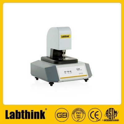 將預先處理好的薄型試樣的一面置于下測量面上,與下測量面平行且中心對齊的上測量面,以一定的壓力,落到薄型試樣的另一面上,同測量頭一體的傳感器自動檢測出上下測量面之間的距離,即為薄型試樣的厚度。