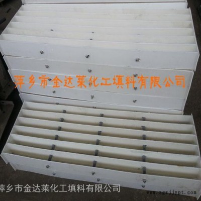 塑料支撐格柵填料是一種新型的規(guī)整填料,由聚丙烯、增強聚丙烯、聚氯乙烯、氯化聚氯乙烯、聚偏氟乙烯、PPH等板材經(jīng)過一定的加工工藝,并根據(jù)塔徑和人孔的尺寸用塑料/金屬(桿、管、螺母)構(gòu)件組合在一起的,其中板片作為主要傳質(zhì)構(gòu)件。板片垂直于塔截面,與氣流和液流方向平行,上下兩層呈450旋轉(zhuǎn)。氣體和液體有固定的通道,流體在板片之間不斷沖刷接觸,使得含有固體顆粒或含塵氣體和液體不會在填料表面停滯、沉積、淤積和堵塞。因此格柵填料是一種高效、大通量、低壓降,不堵塔的新型規(guī)整填料,對于煤氣的冷卻除塵、脫硫等具有較大的優(yōu)越性。