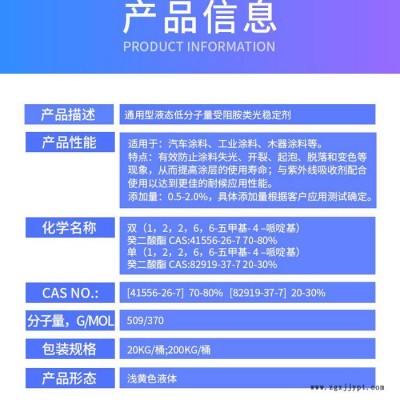 有效防止涂料失光、開裂、起泡、脫落和變色等現象,從而提高涂層的使用壽命;與紫外線吸收劑配合使用以達到更佳的耐候應用性能。